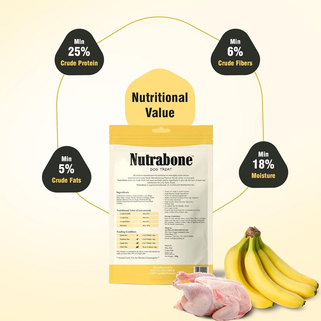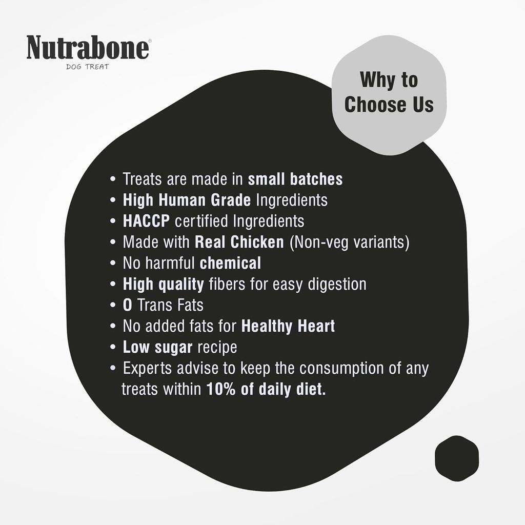 Nutrabone treats are made from real chicken and high quality ingredients to provide the best of taste and satisfaction for your Pets. Treats are made in small batches. High quality human grade ingredients. HACCP certified ingredients. Made with real chicken (Non-vegetarian). No harmful chemicals. High quality fiber for easy digestion. Zero Trans fats. No added fats for healthy heart. Low sugar recipe. Experts advise to keep the consumption of any treats within 10 % of daily diet. Storage Guidelines: Stored in cold and dry place away from direct sunlight make sure the seat is in touch before buying. Refrigerate after opening. Consume within one month. Not for human consumption.