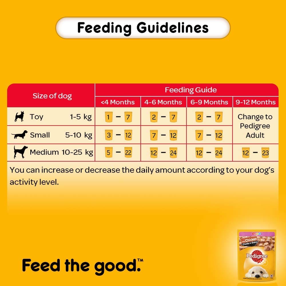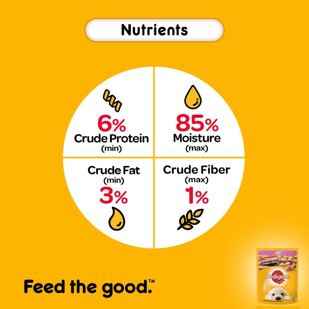 Pedigree wet dog food is a nutritious and balanced meal for your pet dog. Made with ingredients, Pedigree provides dogs the 5 Signs of Good Health – healthy skin and coat, strong bones and teeth, healthy digestive system, strong muscles and strong immune system. Containing a higher moisture content, Pedigree gravy food pouches are especially required for the hot season as they help keep your pooch hydrated and therefore, energetic. It can be mixed with any meal - Pedigree dry food or home cooked food - to enhance taste and improve moisture-content. The tempting aroma and flavour of wet dog food is also effective in attracting fussy eaters into eating their meal. The entire Pedigree Dog food range is formulated by research done by the Waltham Centre for Pet Nutrition, a leading scientific authority in pet nutrition and well-being for over 50 years. Everything we do at Pedigree is for the love of dogs because dogs bring out the good in us and Pedigree Pet food brings out the good in them.